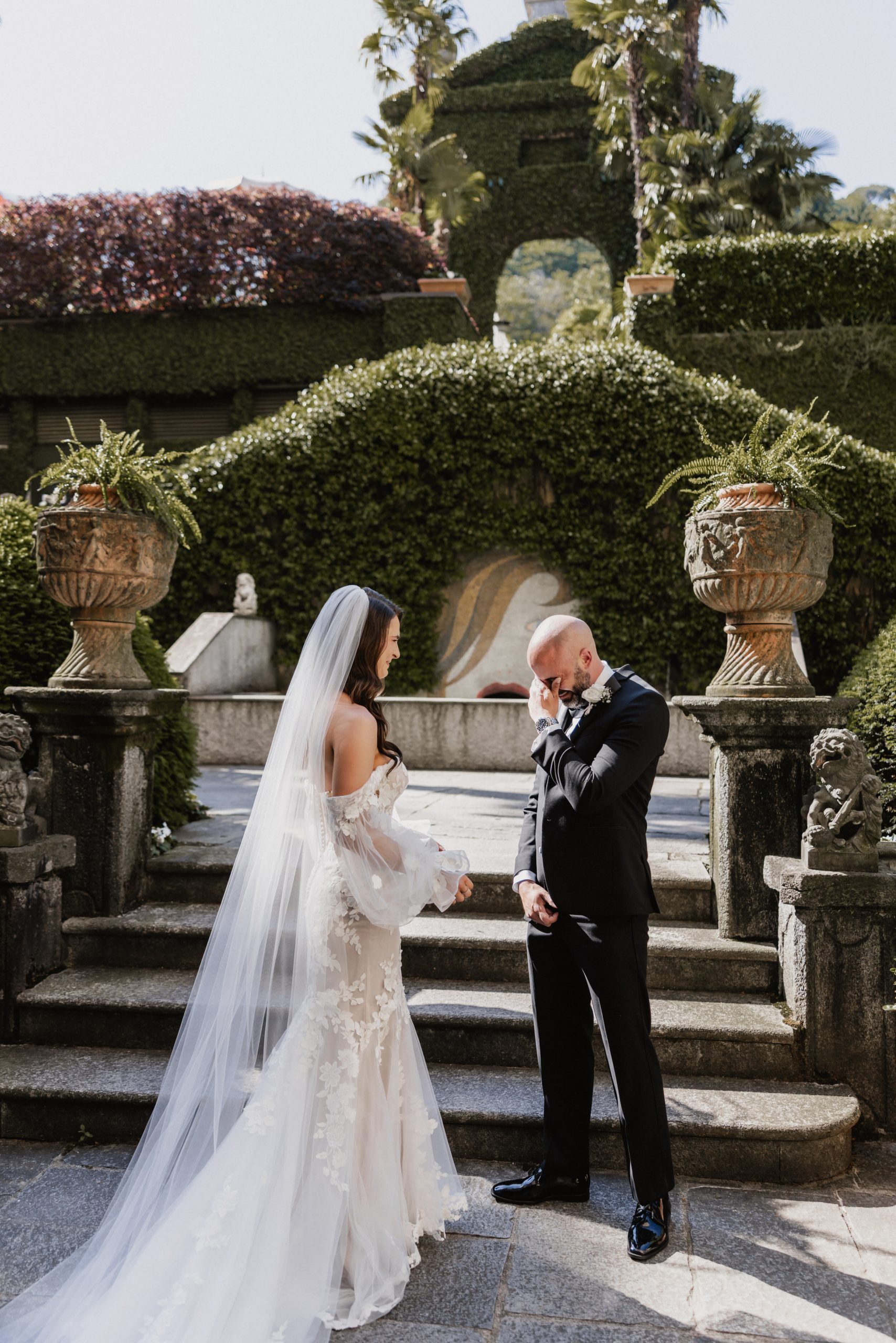 Their first look took place in the villa gardens, followed by a lakeside ceremony with live violin and only the essentials. Emotion. Atmosphere. Nothing forced.