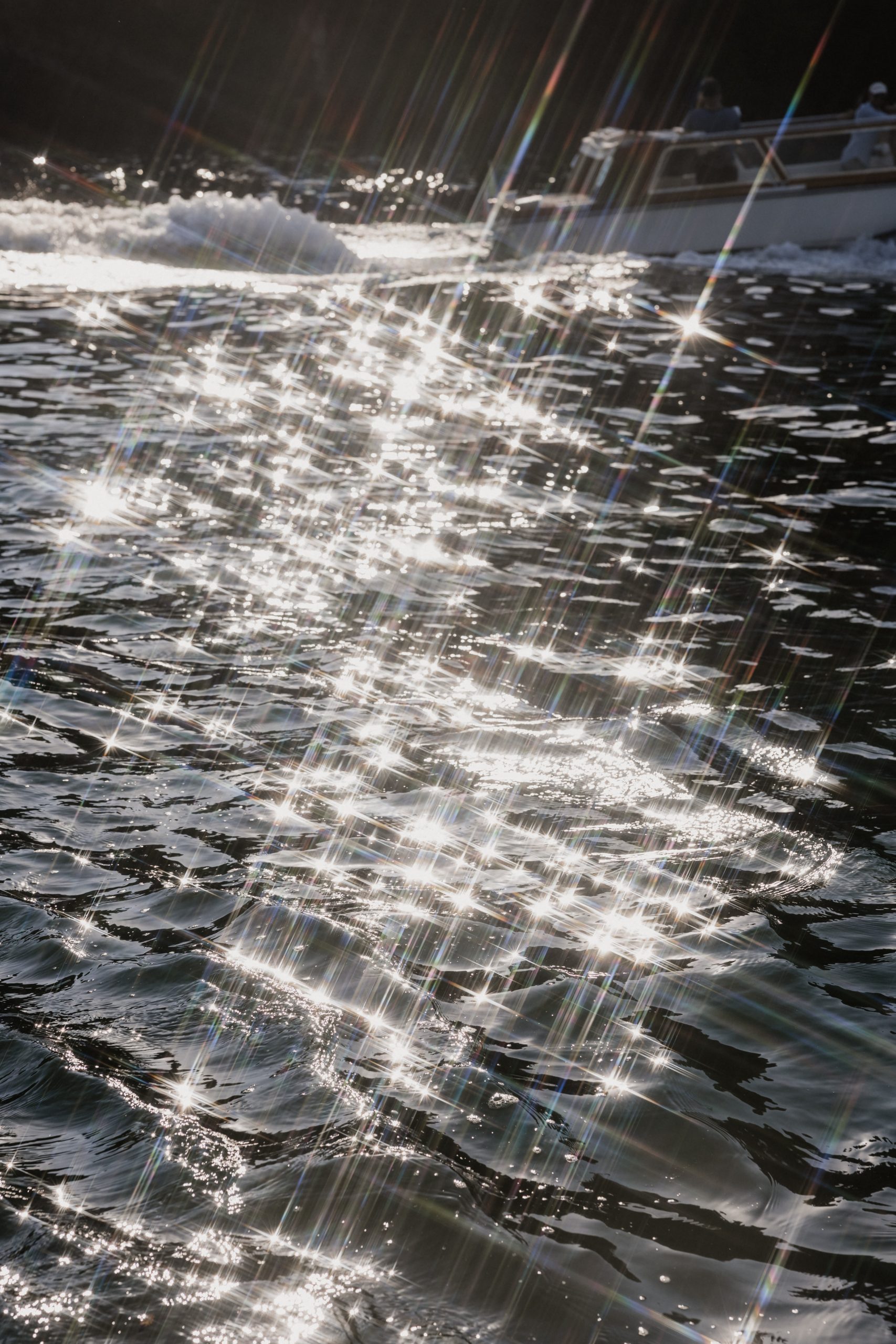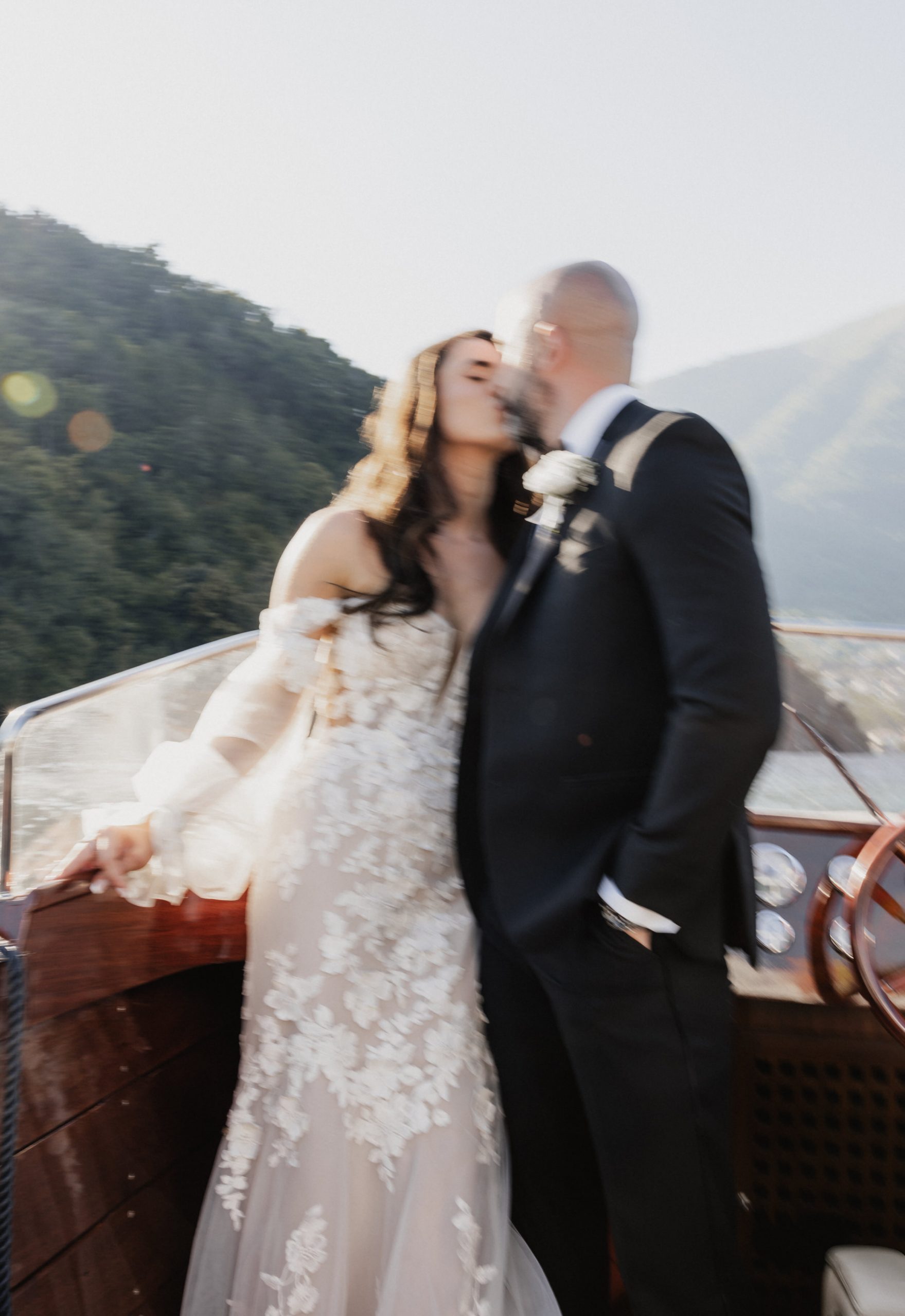 Afterwards, a vintage boat waited. They slipped away into golden hour—hair catching the breeze, champagne in hand, the mountains behind them fading into shadow.