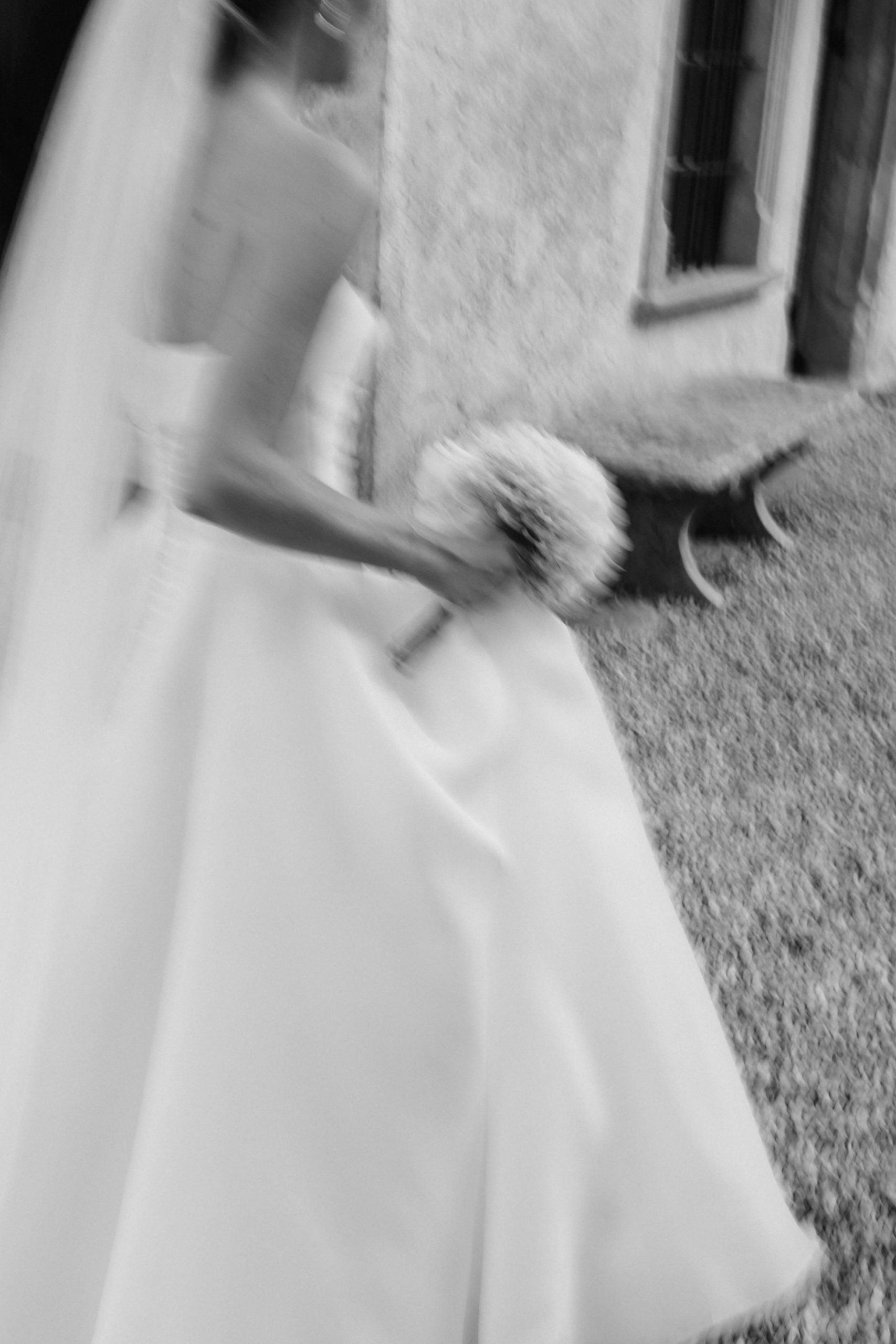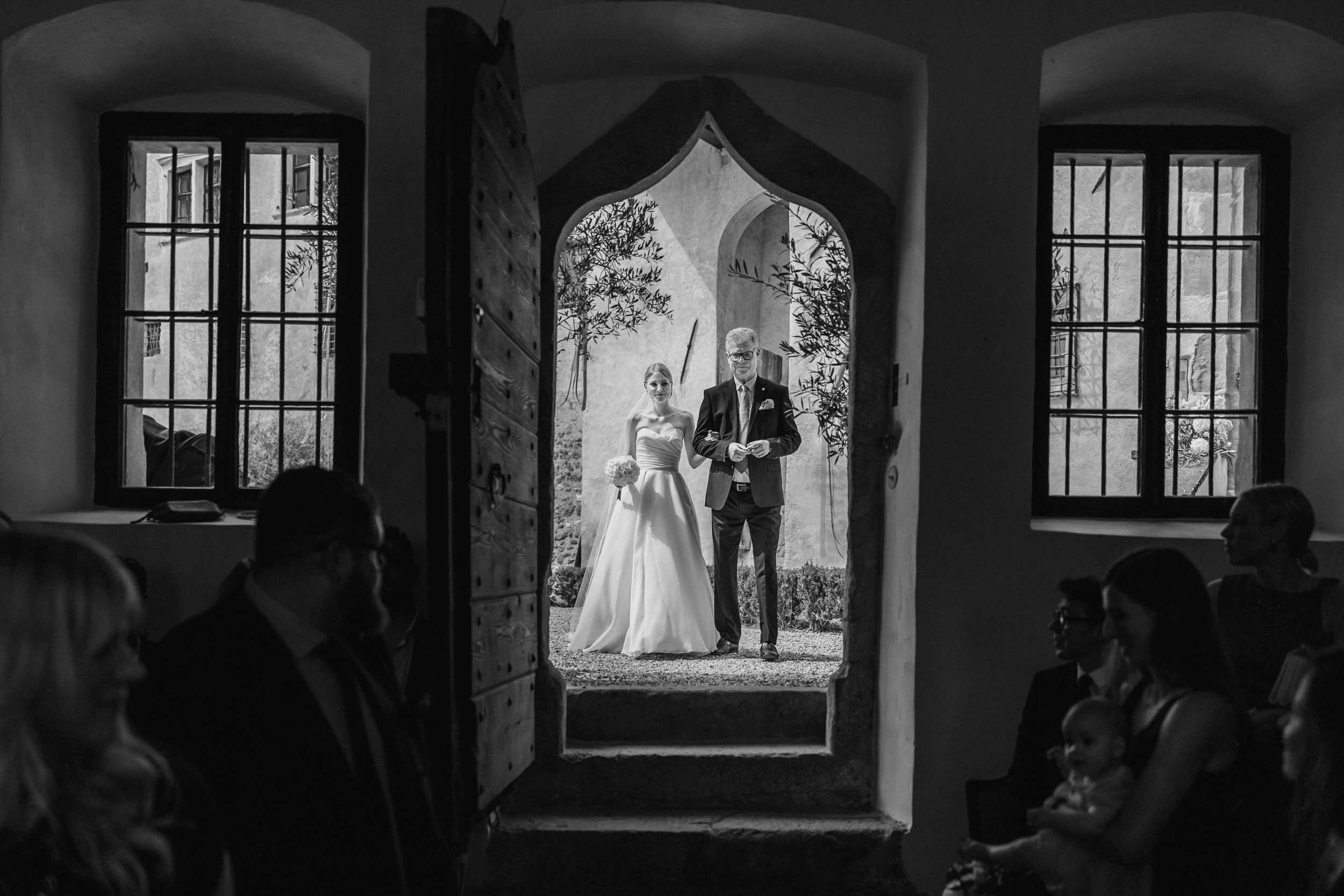 The ceremony took place in the small chapel just in front of the castle—intimate, emotional, framed by soft florals and weathered stone.