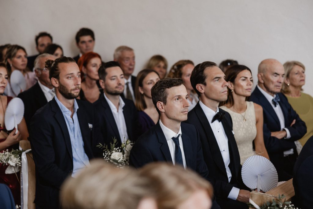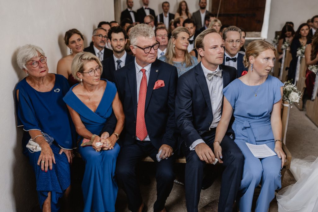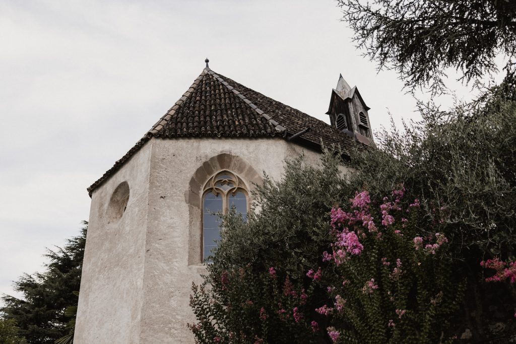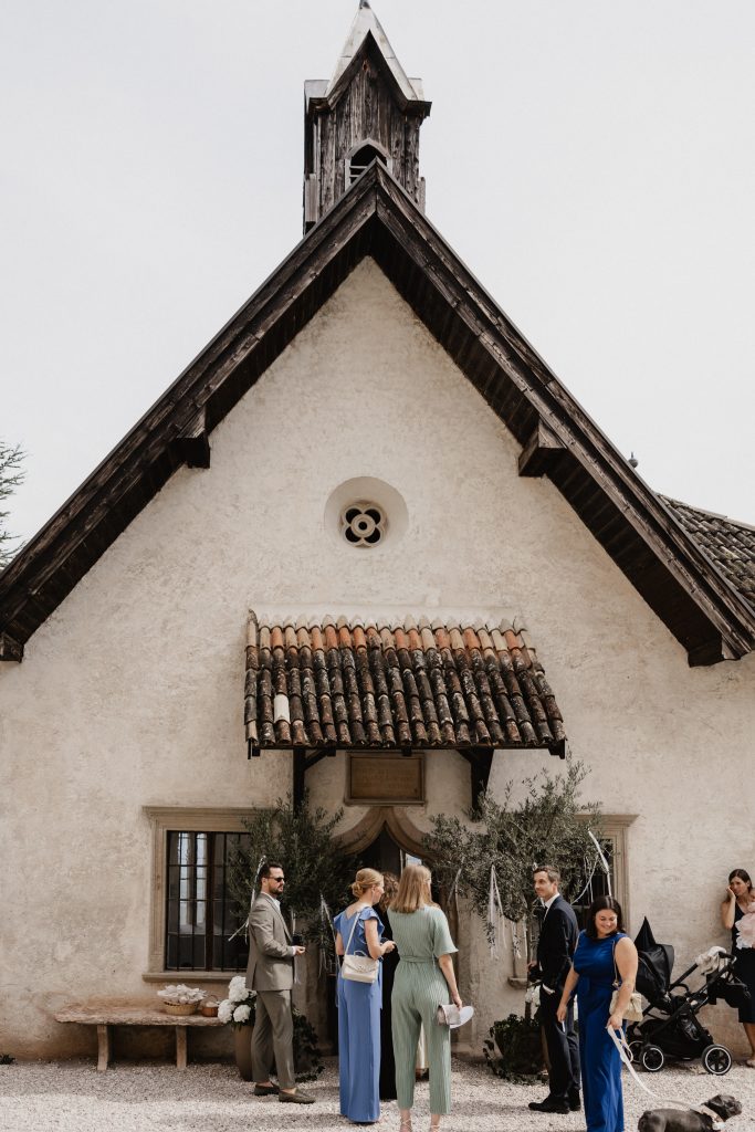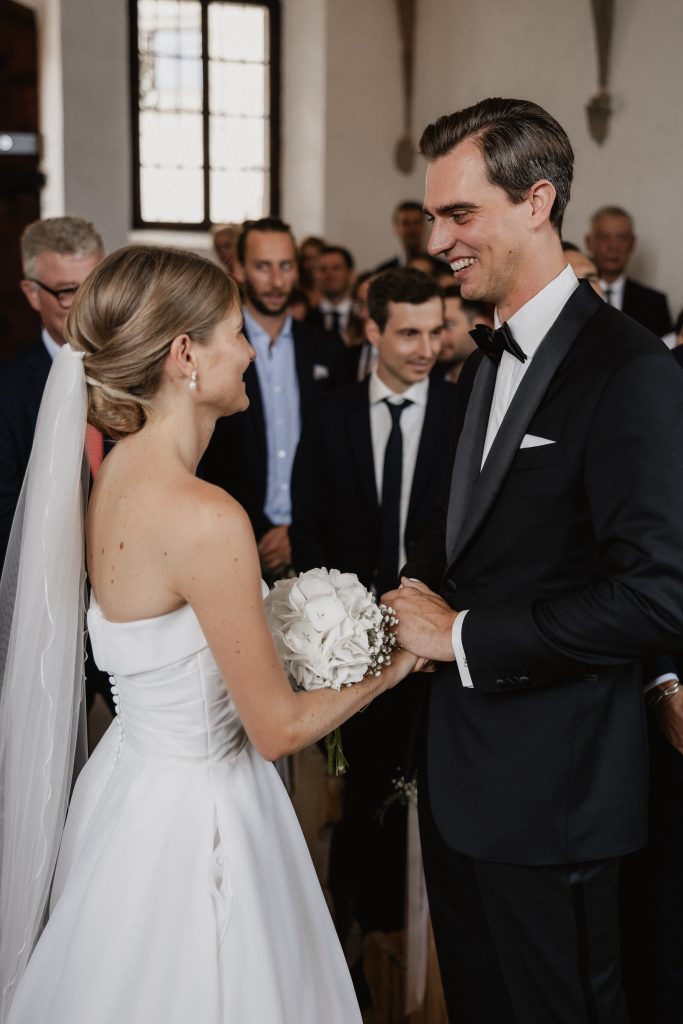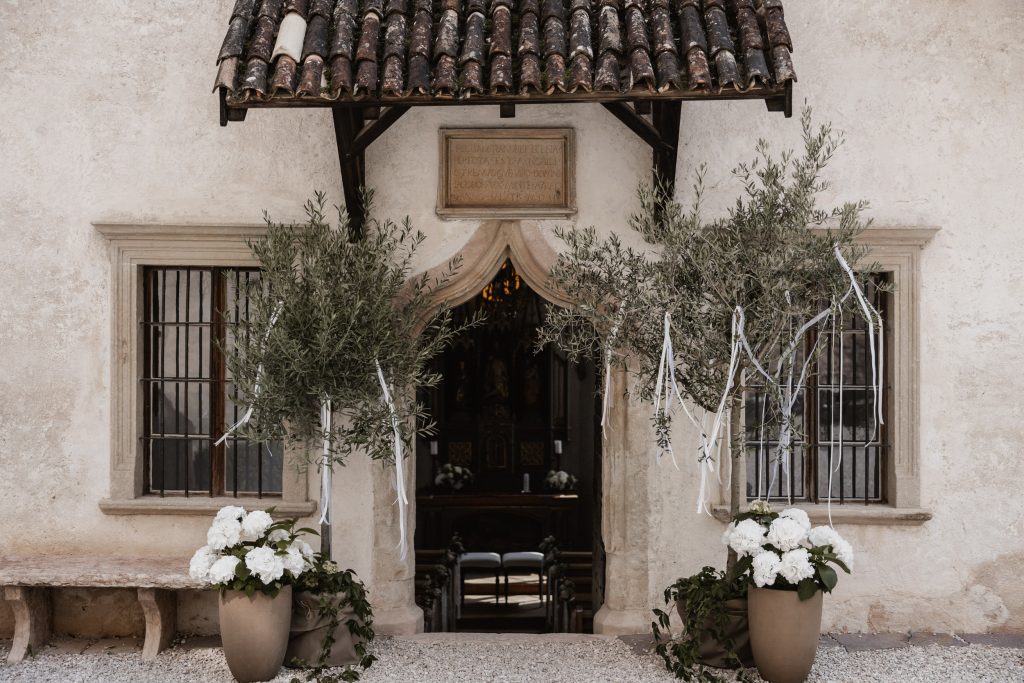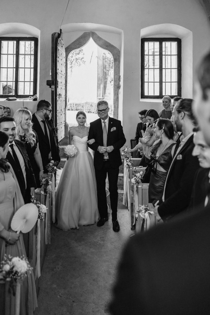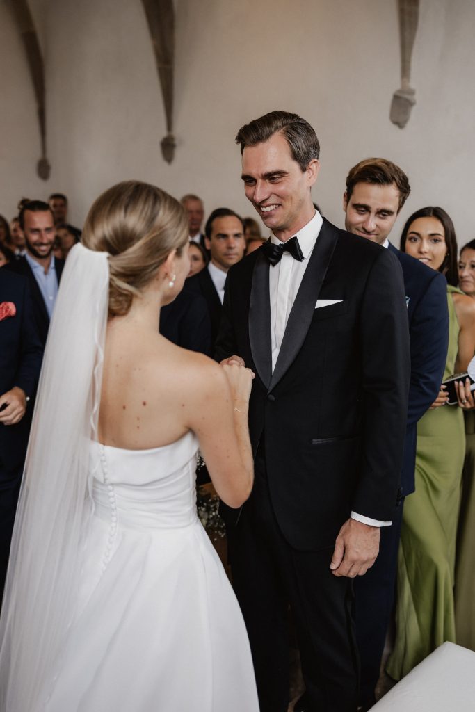 The ceremony took place in the small chapel just in front of the castle—intimate, emotional, framed by soft florals and weathered stone.