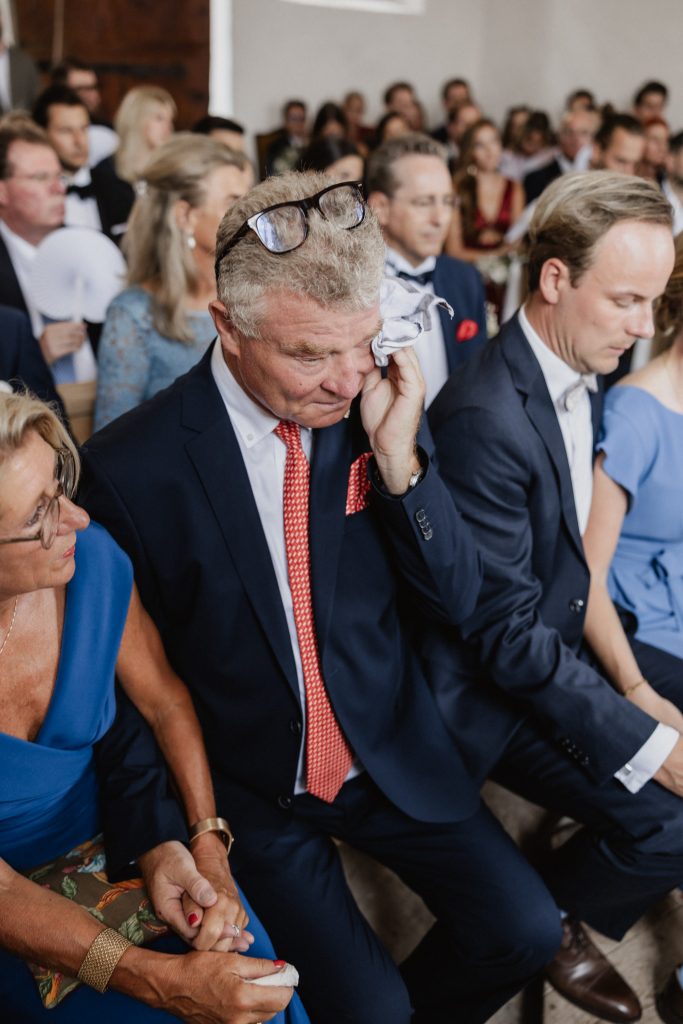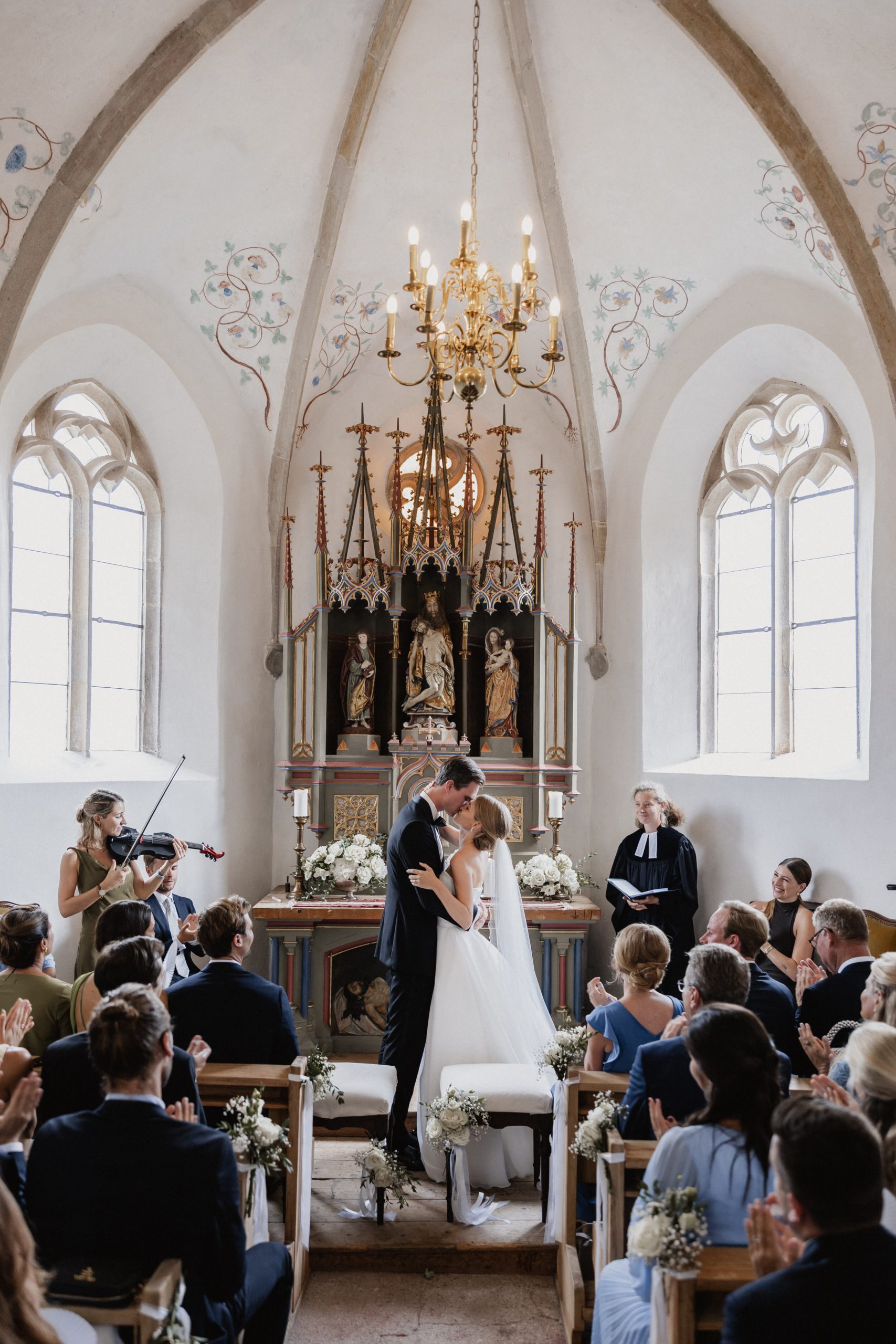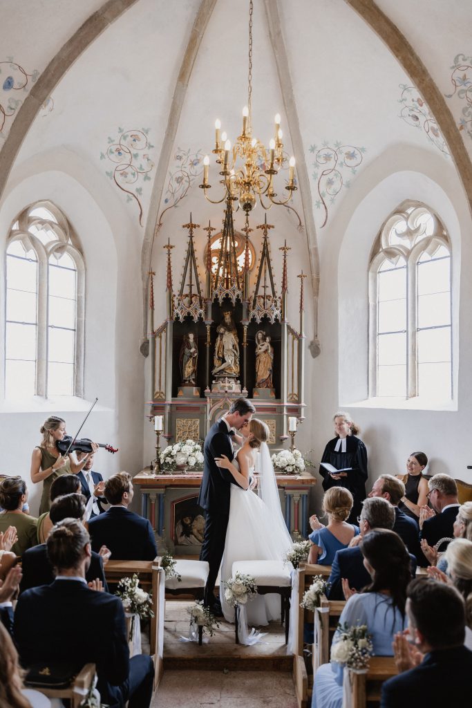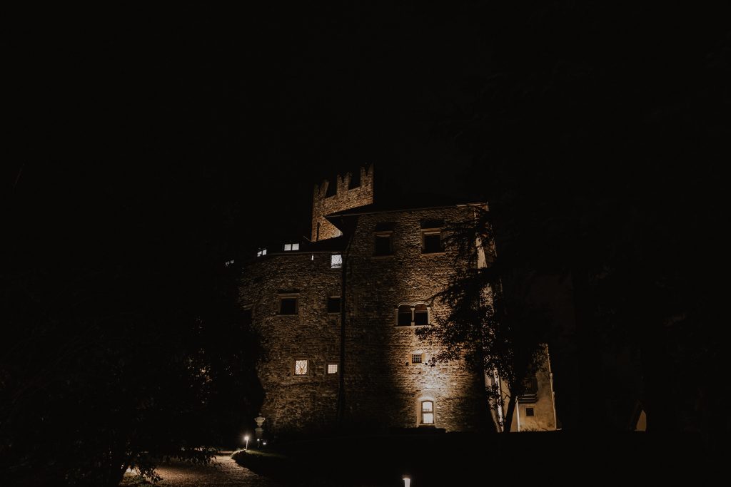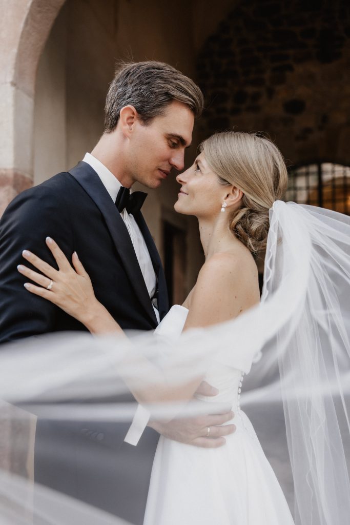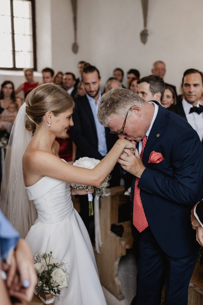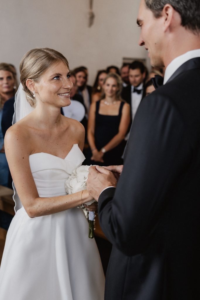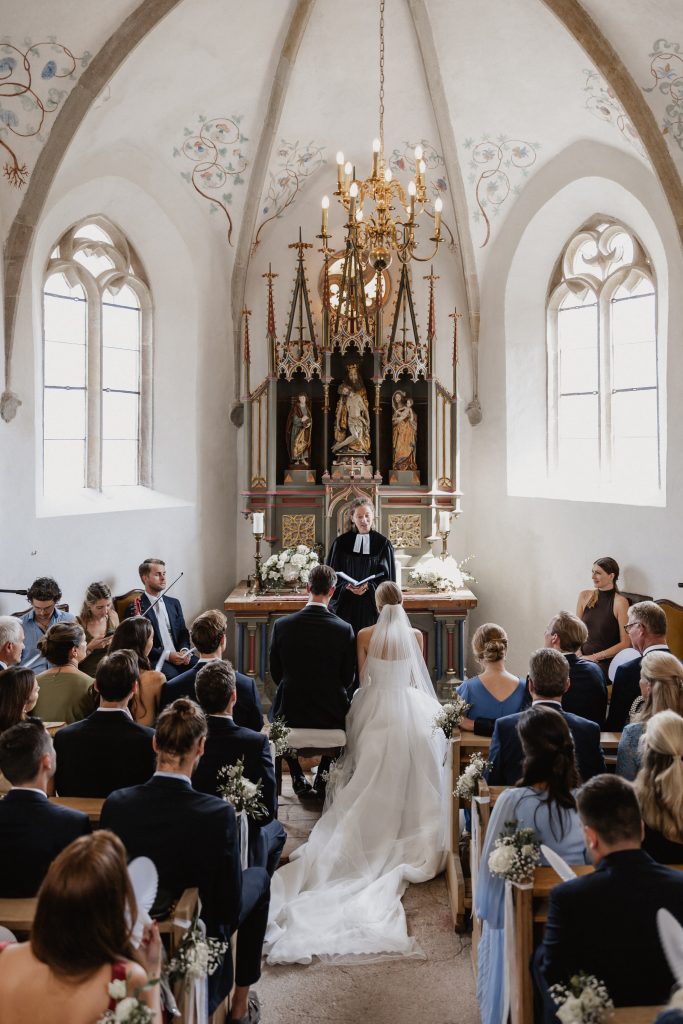 The ceremony took place in the small chapel just in front of the castle—intimate, emotional, framed by soft florals and weathered stone.