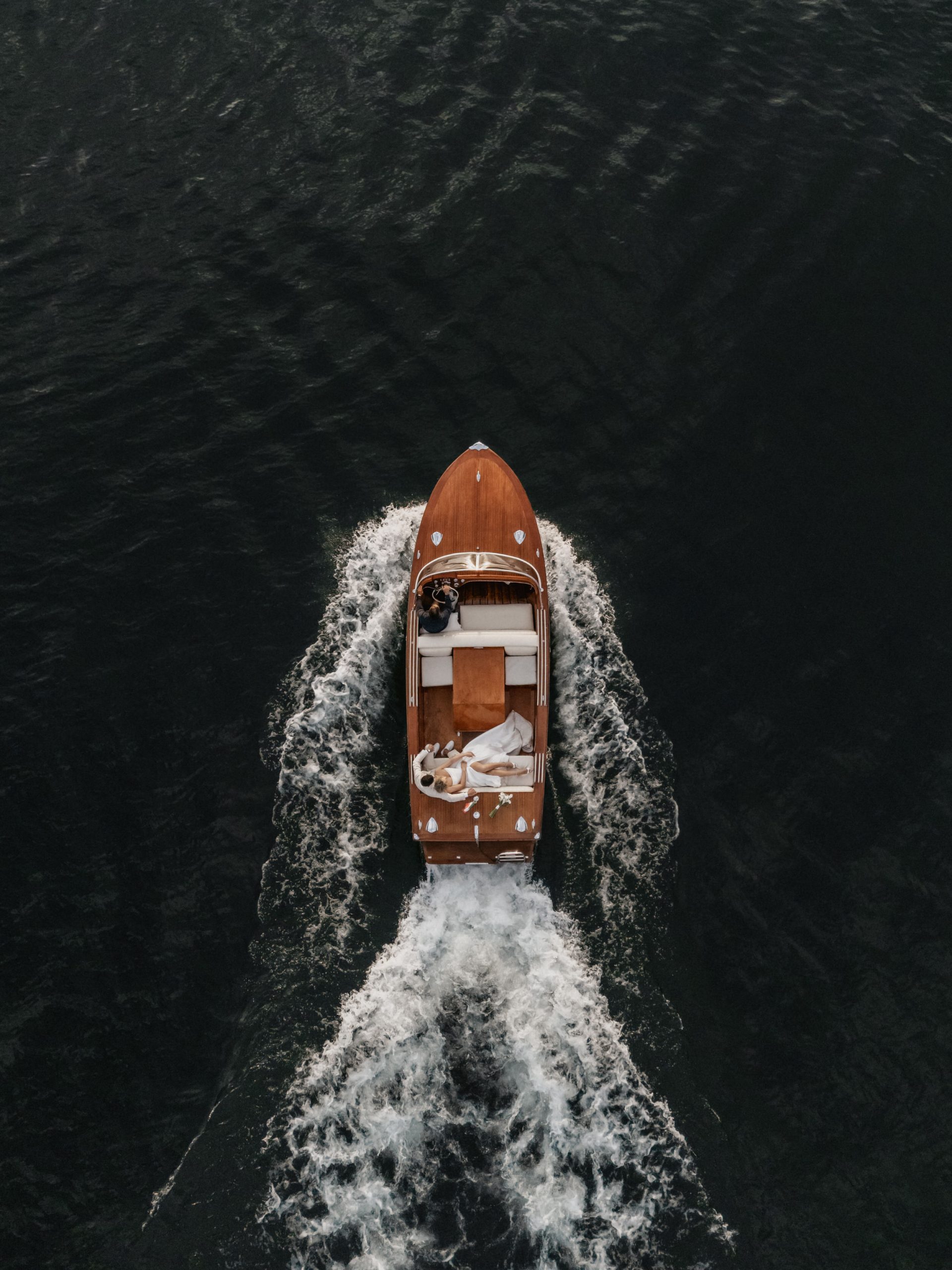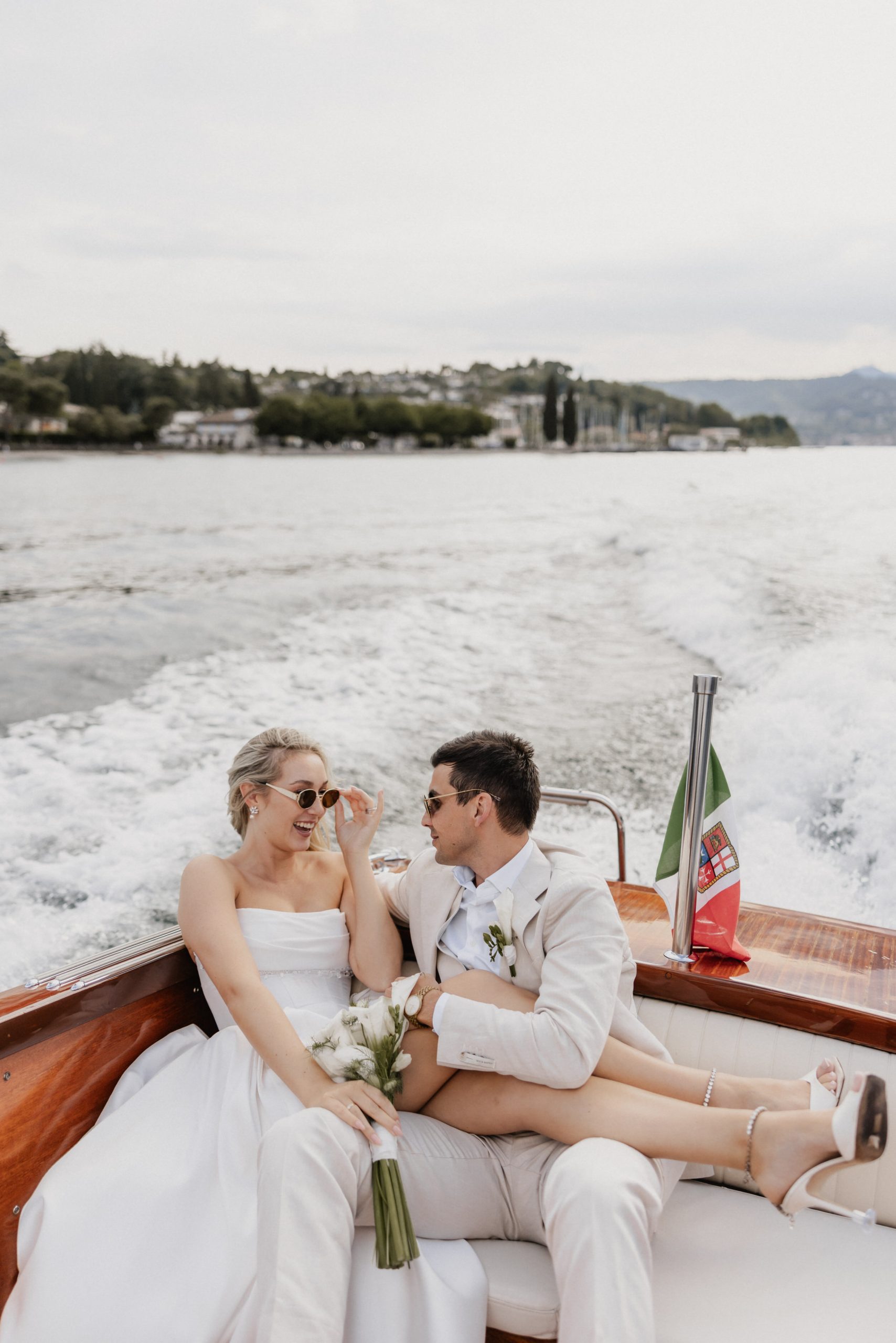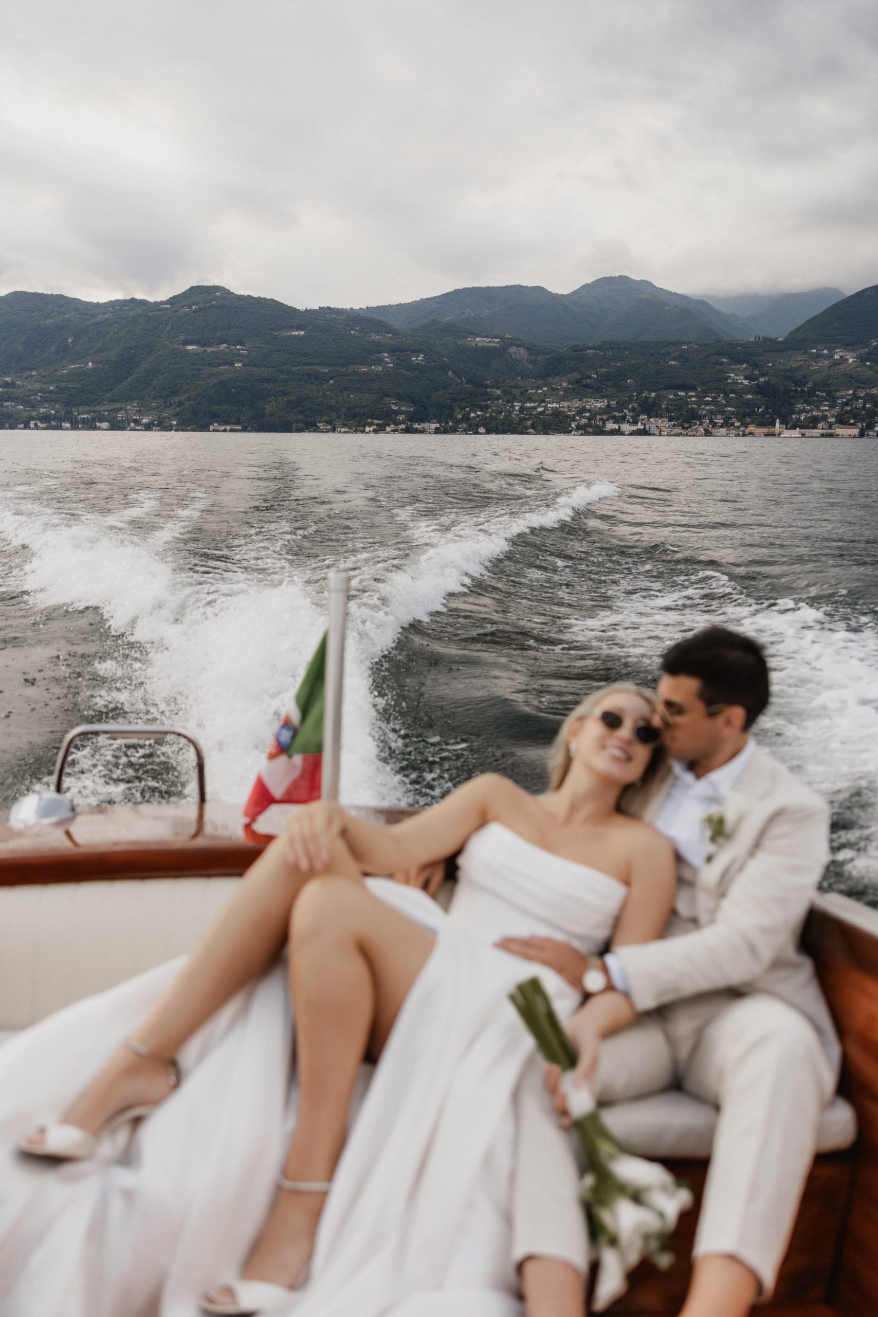 Planned by the incredible team at Somewhere Crazy, every part of the day was intentional but relaxed—from slow, champagne-filled getting ready moments to the golden light spilling over the garden ceremony at Villa Arcadio. Tay got ready with her mum and closest people at A-ROSA Lago di Garda. Hair and makeup by Giulia was everything you’d want for an Italian elopement: glowy skin, soft waves, and a modern editorial edge that still felt completely her. The ceremony took place in Villa Arcadio’s garden—the view, stone walls, and the kind of atmosphere you can’t fake. After the vows, the couple slipped away for a boat ride across Lake Garda as the sun dropped low behind the mountains.