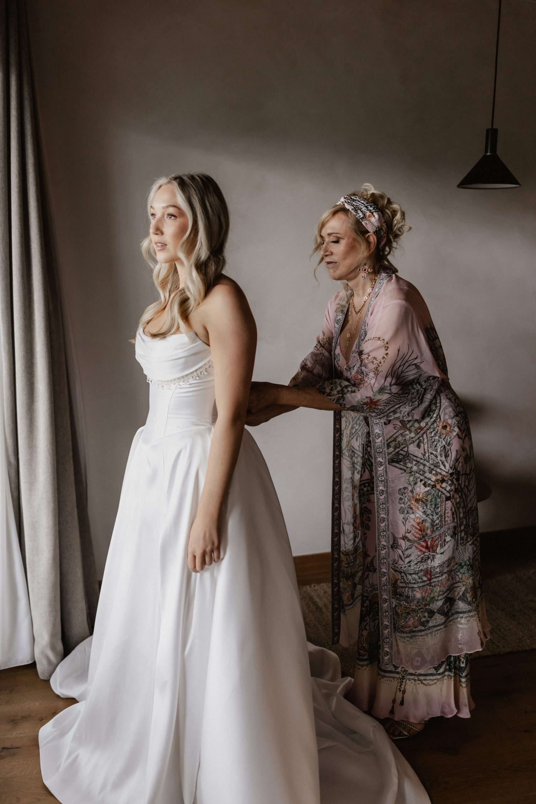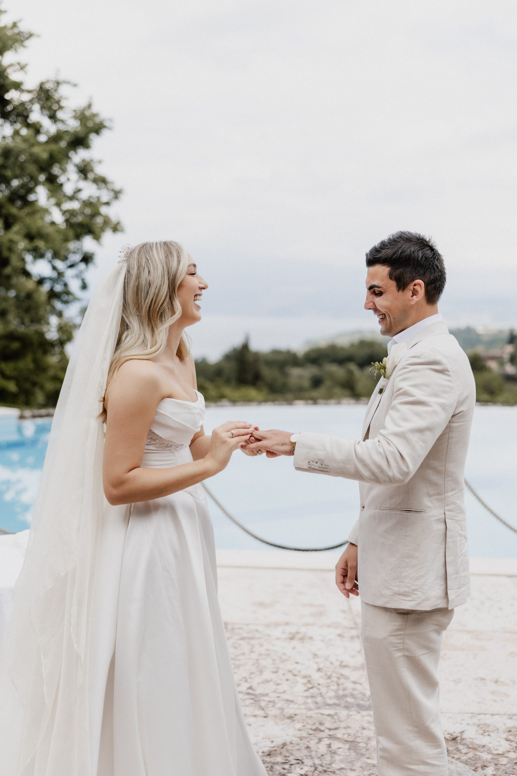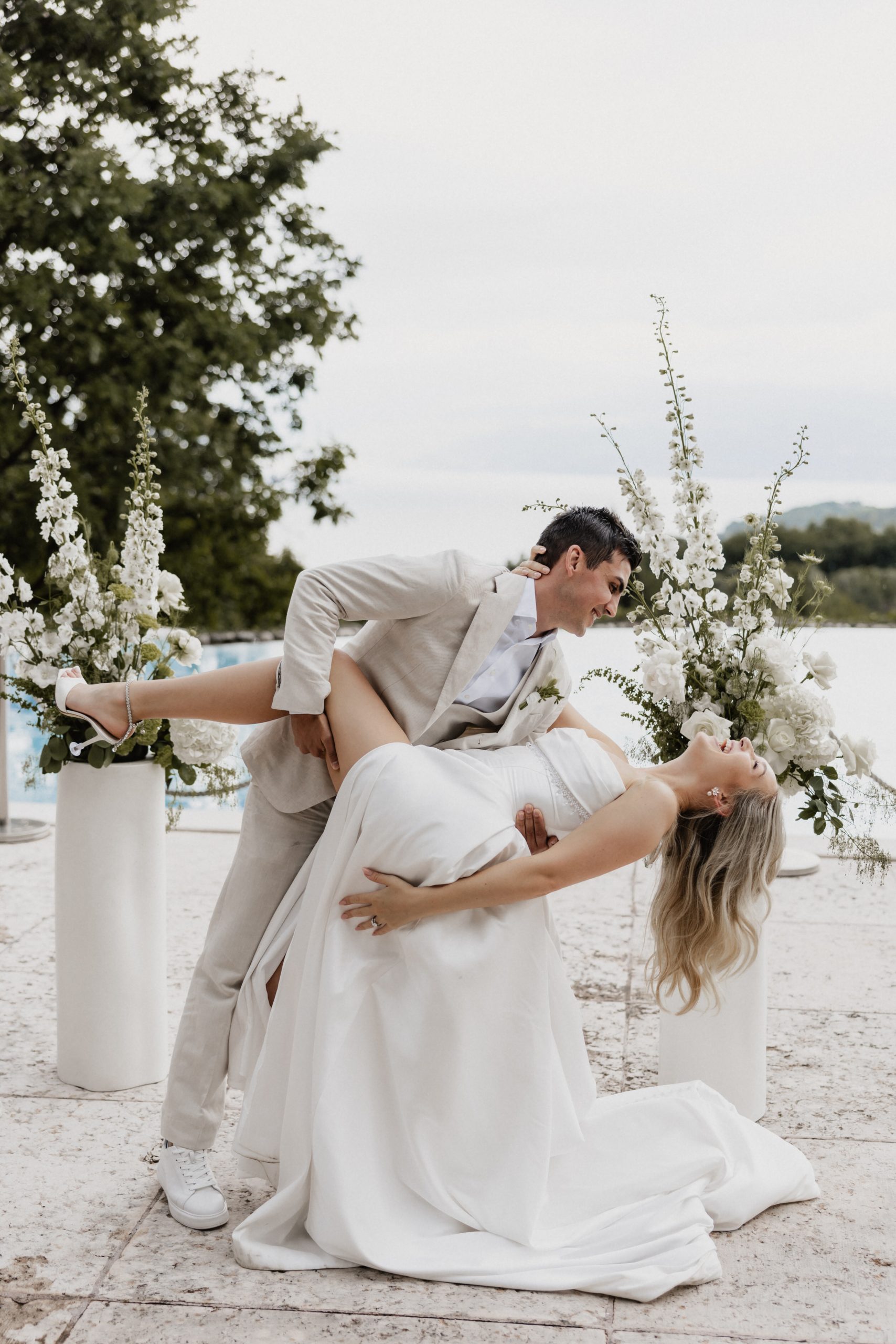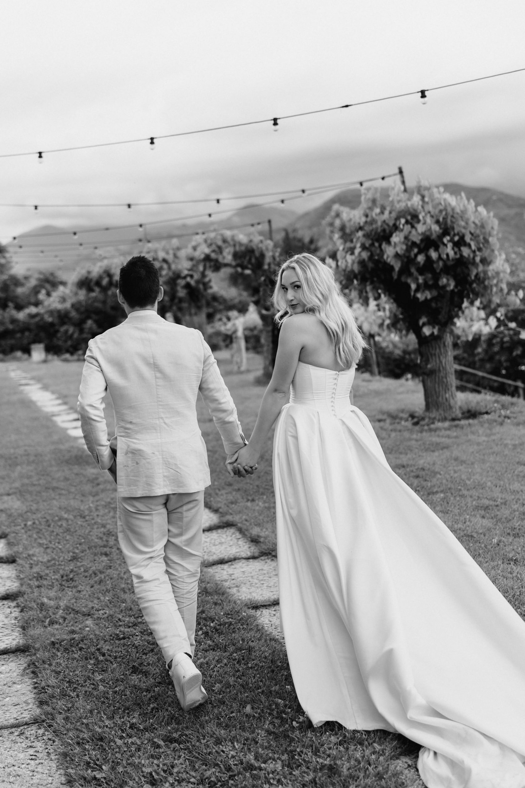 Planned by the incredible team at Somewhere Crazy, every part of the day was intentional but relaxed—from slow, champagne-filled getting ready moments to the golden light spilling over the garden ceremony at Villa Arcadio. Tay got ready with her mum and closest people at A-ROSA Lago di Garda. Hair and makeup by Giulia was everything you’d want for an Italian elopement: glowy skin, soft waves, and a modern editorial edge that still felt completely her. The ceremony took place in Villa Arcadio’s garden—the view, stone walls, and the kind of atmosphere you can’t fake. After the vows, the couple slipped away for a boat ride across Lake Garda as the sun dropped low behind the mountains.