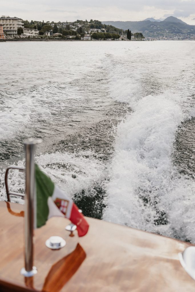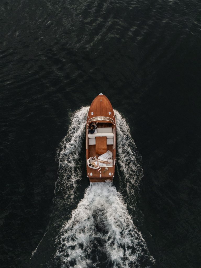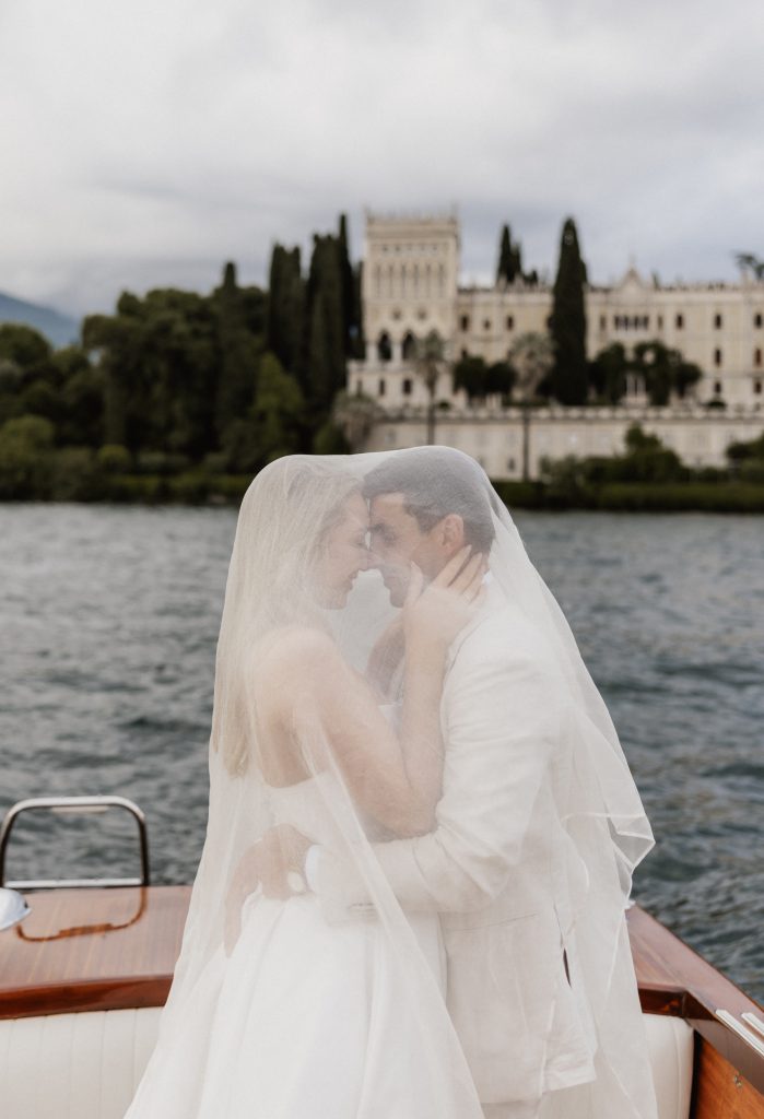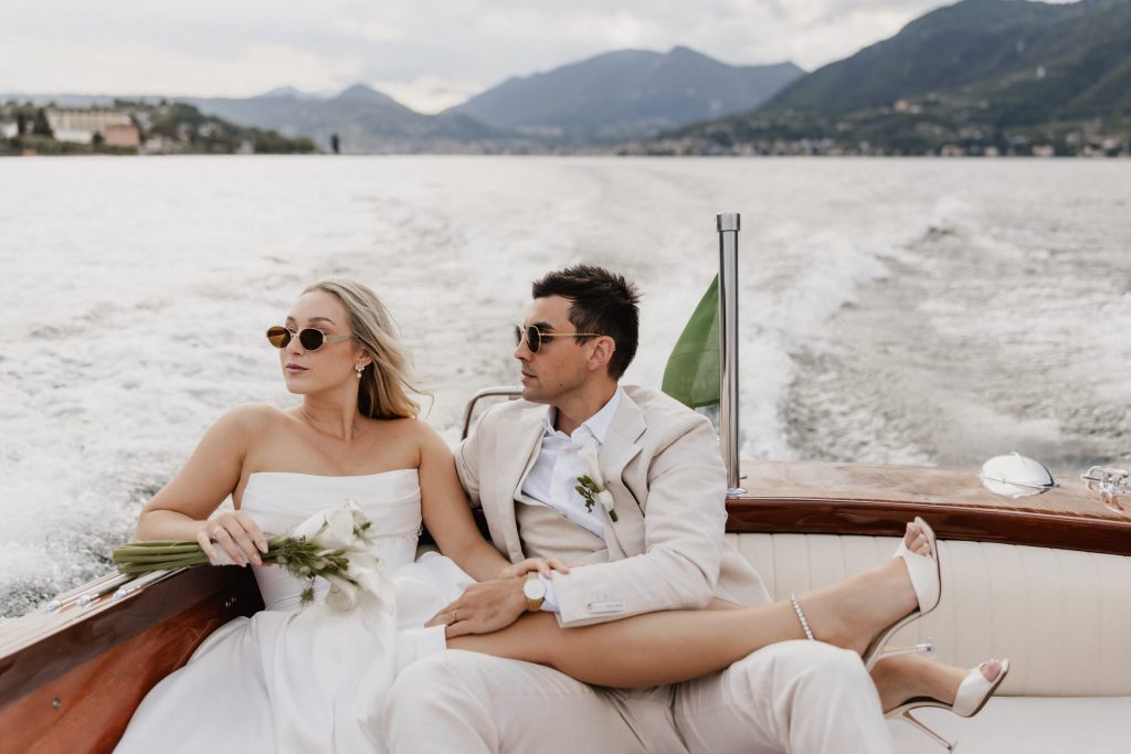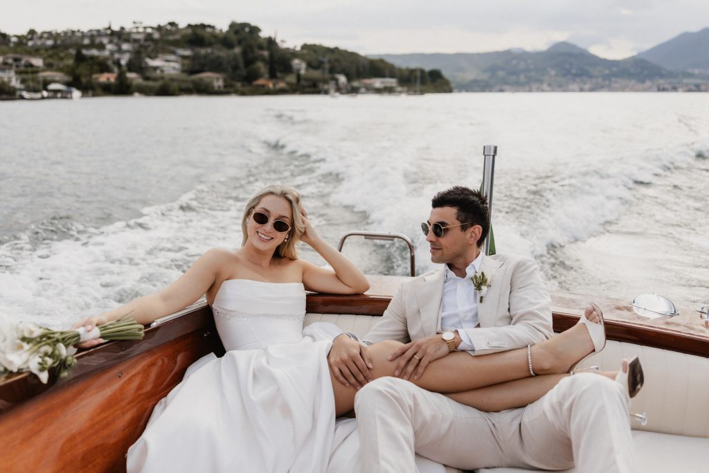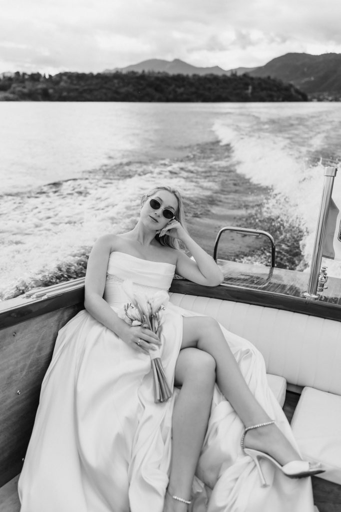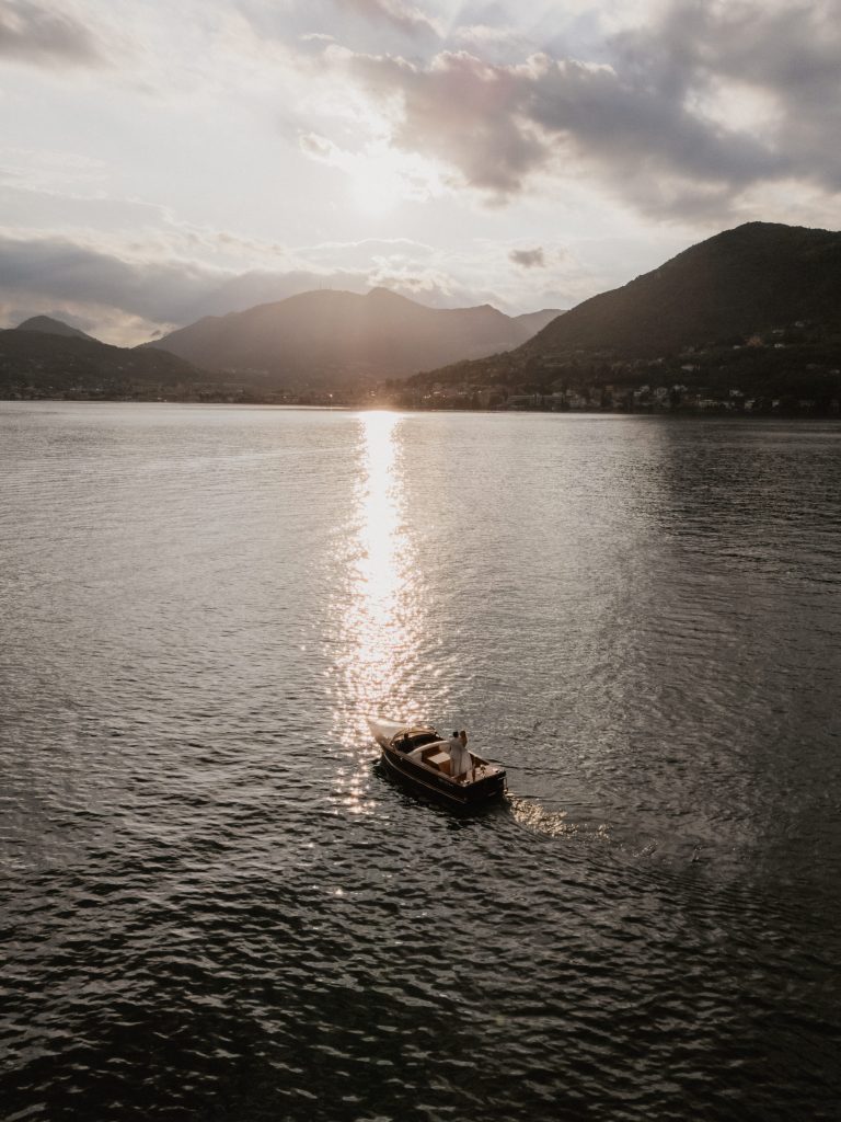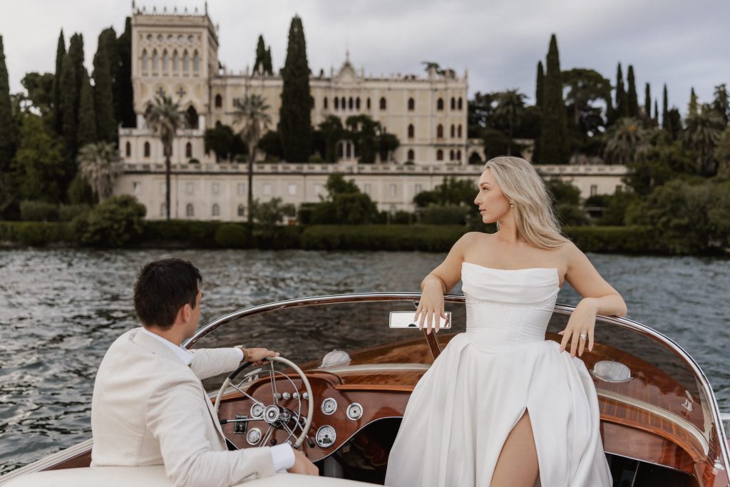 Planned by the incredible team at Somewhere Crazy, every part of the day was intentional but relaxed—from slow, champagne-filled getting ready moments to the golden light spilling over the garden ceremony at Villa Arcadio. Tay got ready with her mum and closest people at A-ROSA Lago di Garda. Hair and makeup by Giulia was everything you’d want for an Italian elopement: glowy skin, soft waves, and a modern editorial edge that still felt completely her. The ceremony took place in Villa Arcadio’s garden—the view, stone walls, and the kind of atmosphere you can’t fake. After the vows, the couple slipped away for a boat ride across Lake Garda as the sun dropped low behind the mountains.