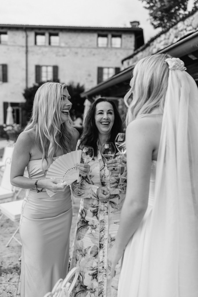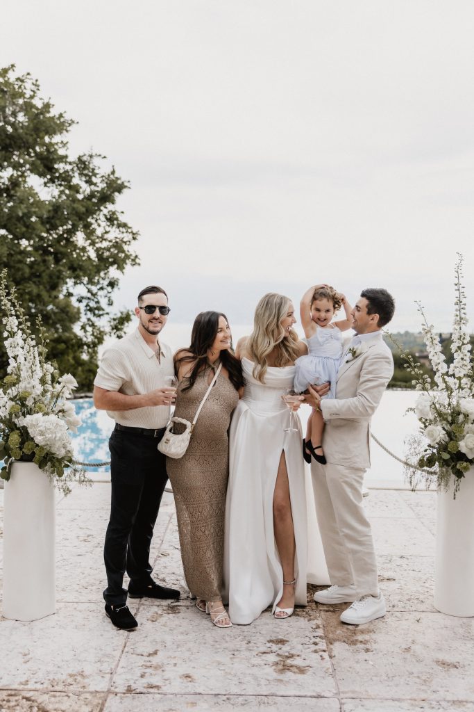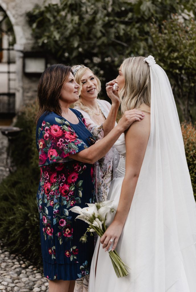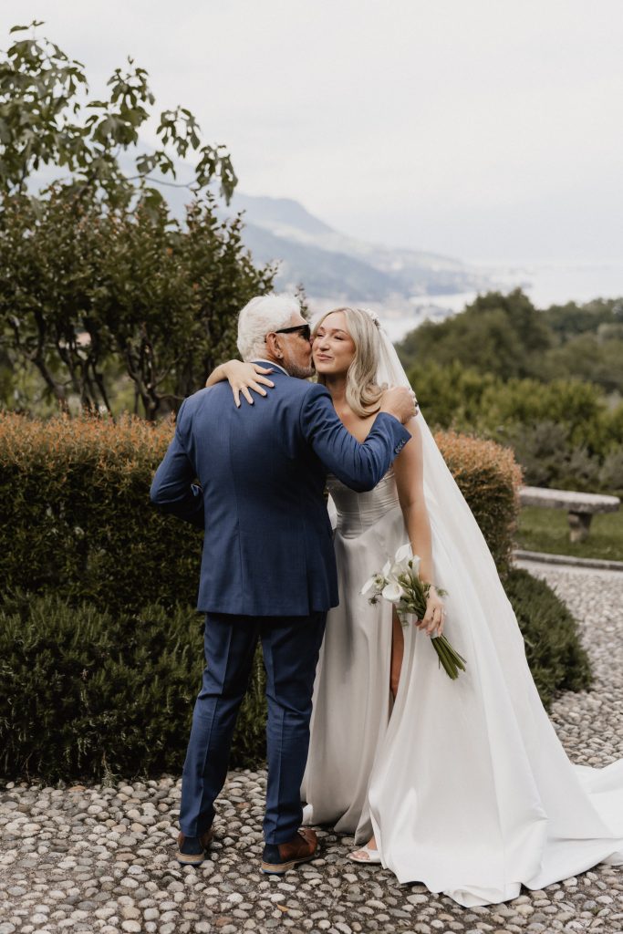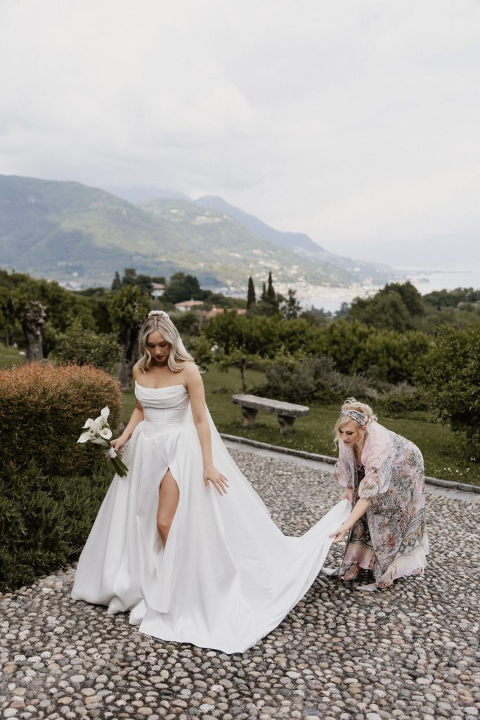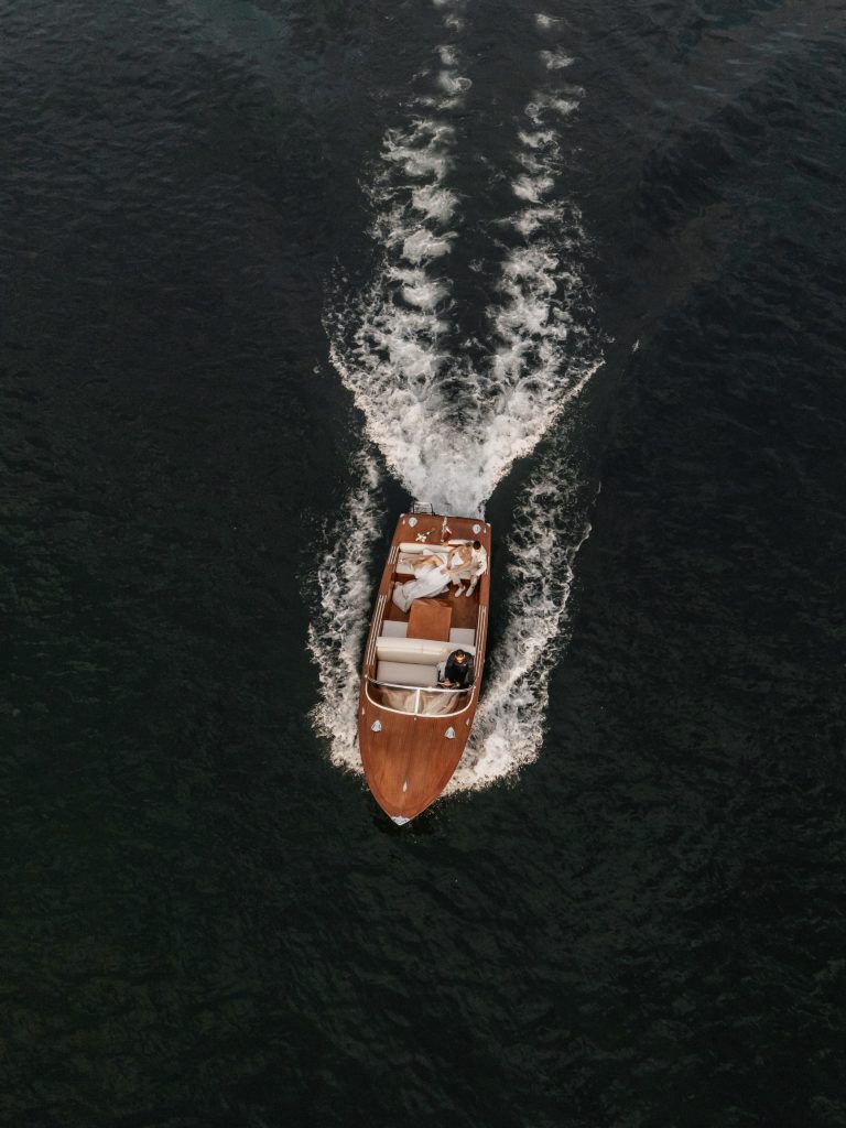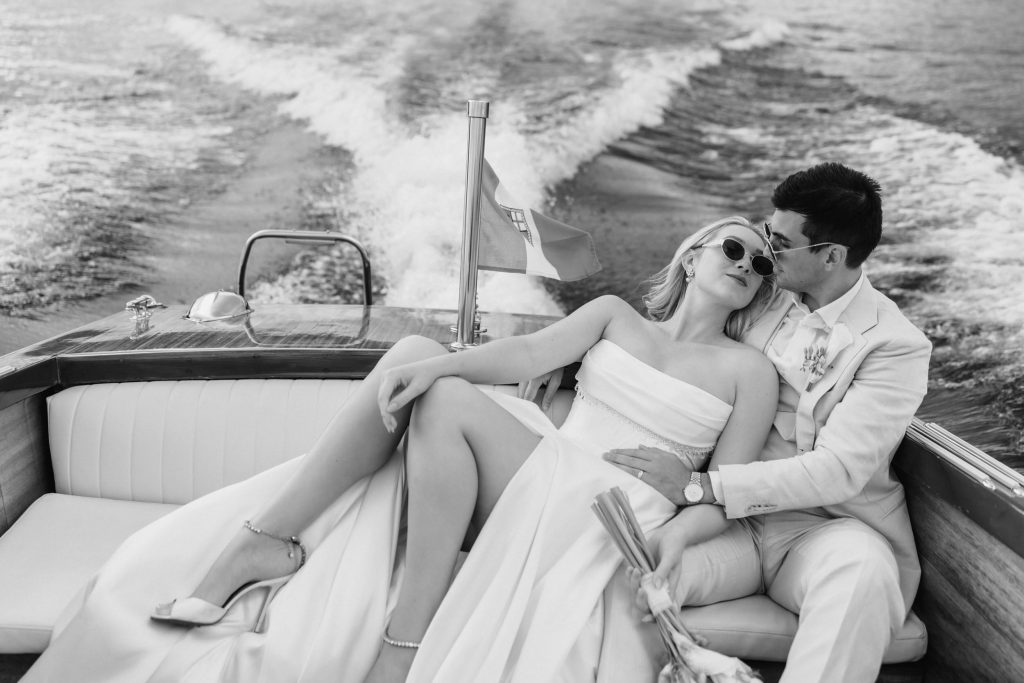 Planned by the incredible team at Somewhere Crazy, every part of the day was intentional but relaxed—from slow, champagne-filled getting ready moments to the golden light spilling over the garden ceremony at Villa Arcadio. Tay got ready with her mum and closest people at A-ROSA Lago di Garda. Hair and makeup by Giulia was everything you’d want for an Italian elopement: glowy skin, soft waves, and a modern editorial edge that still felt completely her. The ceremony took place in Villa Arcadio’s garden—the view, stone walls, and the kind of atmosphere you can’t fake. After the vows, the couple slipped away for a boat ride across Lake Garda as the sun dropped low behind the mountains.